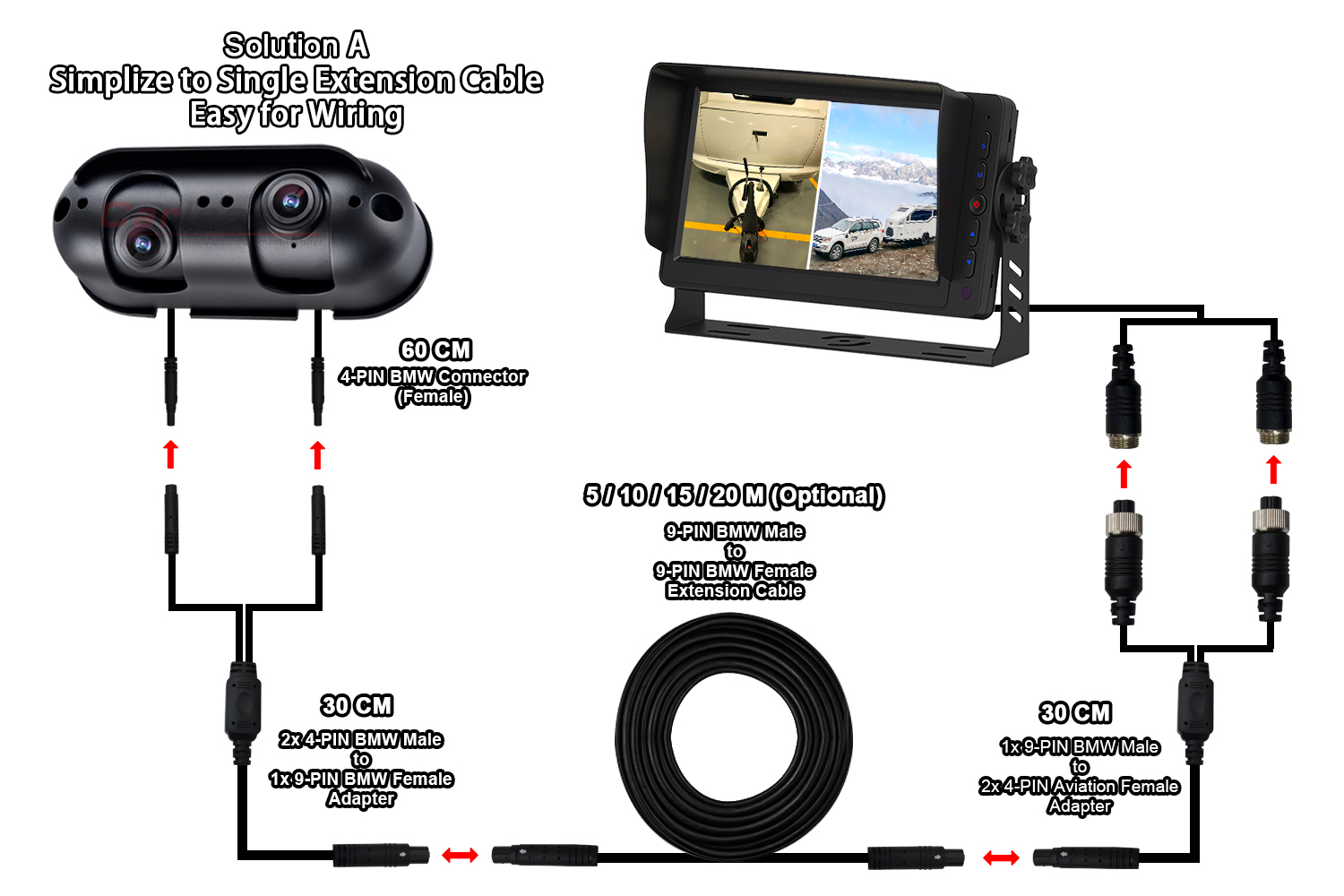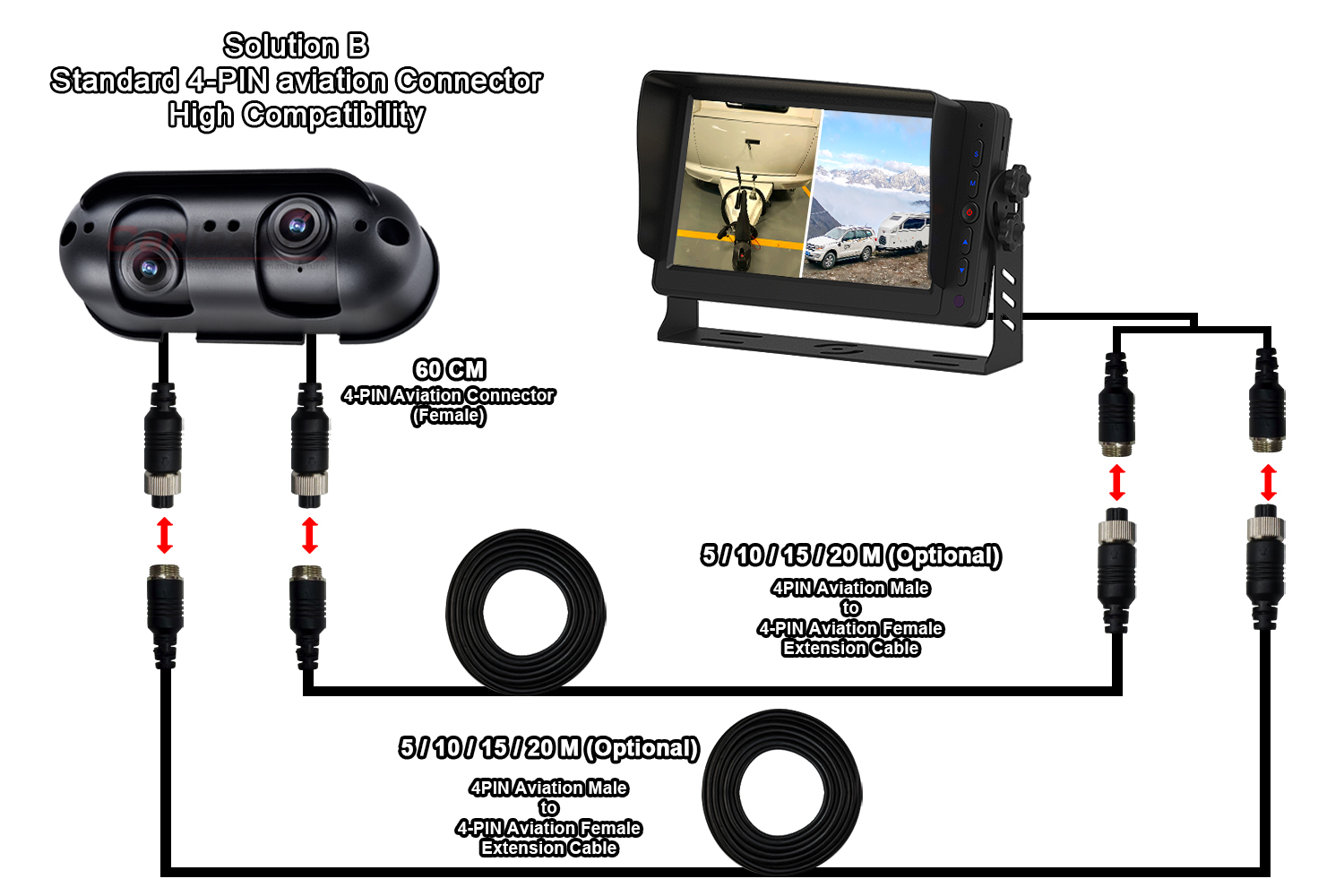 AI Kör Nokta Algılama Arka Görüş Kamerası Dahili Ses ve Işık AlarmıCarleader AHD Starlight Çift Lensli Arka Görüş Kamerası RV Karavan İçin Uygun, tek bir kamerada çift lensle entegre edilmiş, mükemmel kalitede yeni tasarlanmış özel aletli AHD kamera ve lens açısı ayrı ayrı ayarlanarak kullanıcının hem yakın hem de uzak mesafeyi aynı monitörde görüntülemesine olanak tanır. Bu kamera yalnızca kamyon, otobüs, forklift vb. gibi ağır vasıtalara uygun değildir; RV ve karavan gibi motorlu karavan araçları için de uygundur.
