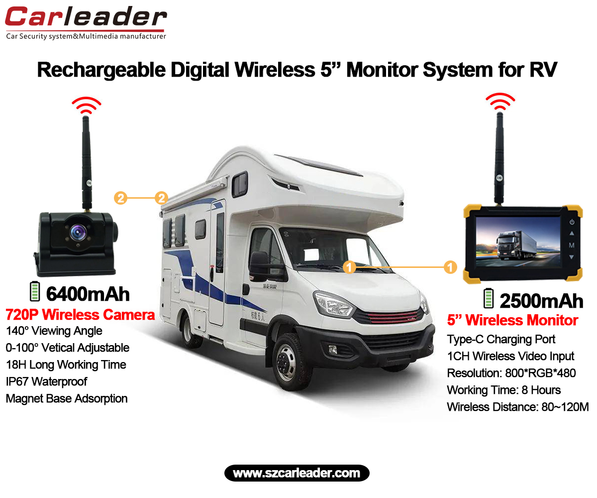 Carleader 5 inç şarj edilebilir dijital kablosuz izleme sistemison teknoloji2.4G Dijital Kablosuz Araç İzleme SistemiSürüş güvenliğini ve rahatlığını artırmak için tasarlanmıştır. Yüksek tanımlı 5 ″ IPS monitörünü ve çok yönlü bir kablosuz kamerayı birleştiren bu sistem, çeşitli ortamlarda sorunsuz çalışma için gerçek zamanlı video iletimi, sağlam dayanıklılık ve kullanıcı dostu özellikler sunar.