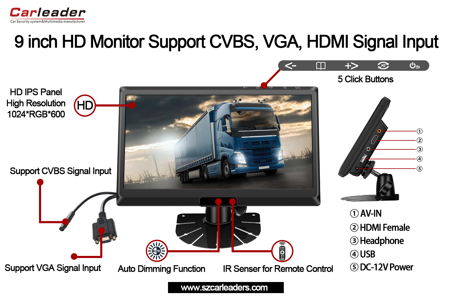 BizimAraba Lideri9 İnç IPS Ekranlı HD Monitör CVBS+HD+VGA Girişlerini DesteklerTüm araç monitörlerimiz arasında en iyi video kalitesine ve netliğine sahiptir ve monitörün üst kısmında 5 özel tıklama düğmesine sahiptir, 9 İnç IPS Ekranlı Araç Monitörü Desteği CVBS,HD,VGA şu anda stoklarımızda mevcuttur ve satıştadır.