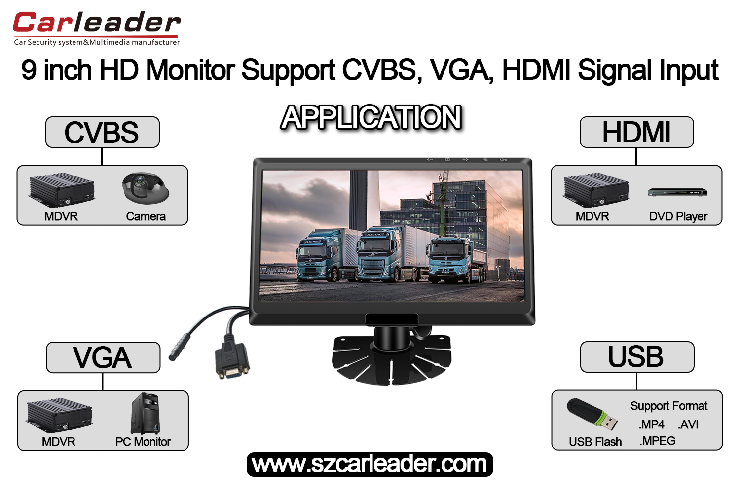 Araba Lideri9 İnç IPS Ekranlı HD Monitör CVBS+HD+VGA Girişlerini Destekleraraç izleme ve MDVR filo yönetimi için tasarlanmış yüksek performanslı bir HD monitördür. Araç monitörü CVBS, HD ve VGA sinyal girişlerini destekler. MDVR'nin VGA veya HD arayüzü varsa, 9 inç IPS ekranlı araç monitörüyle kullanılabilir.