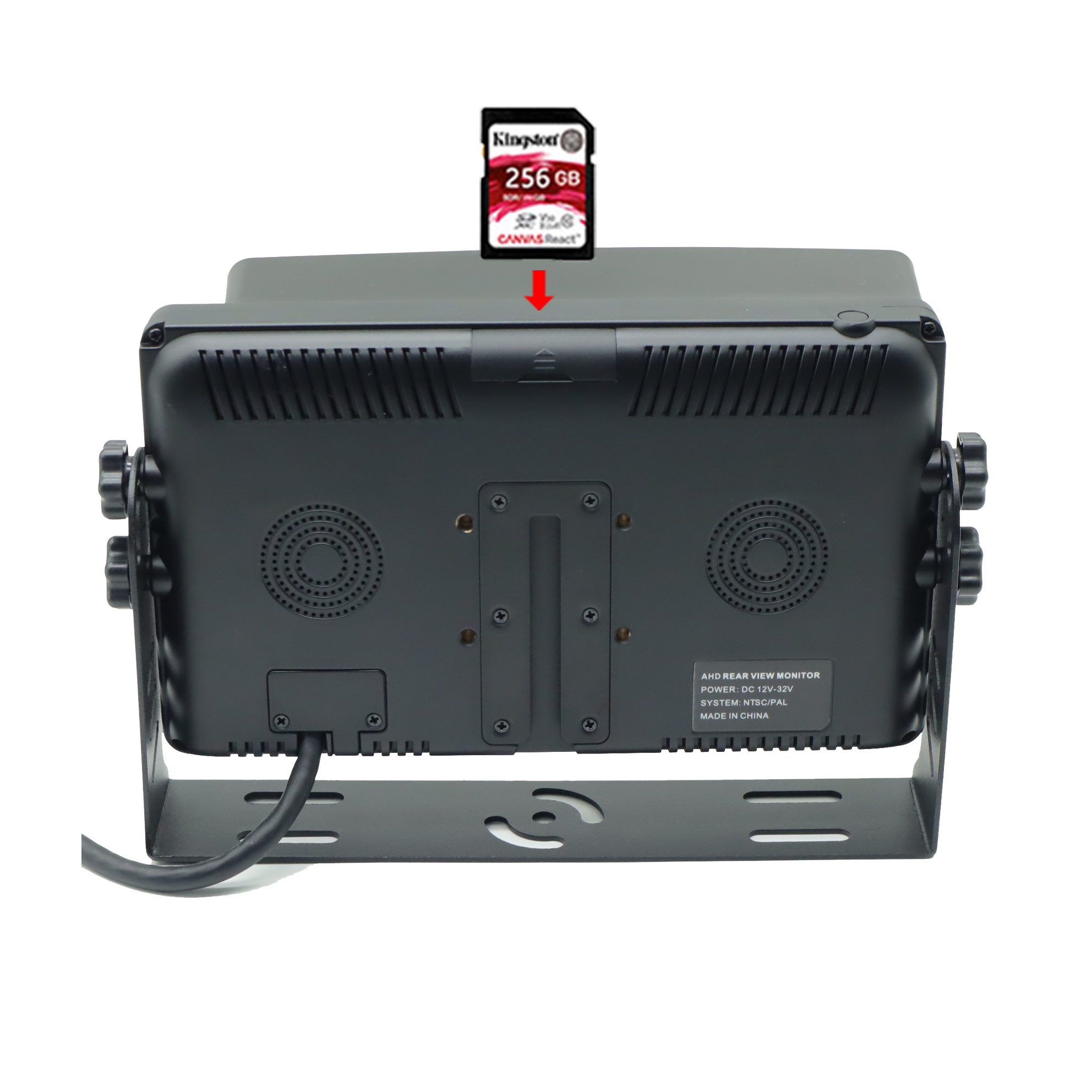Carleader 7 İnç 4CH AHD Girişli Dörtlü Görünümlü Ekran Monitörü, monitörün arkasındaki SD kart yuvasıyla DVR kayıt fonksiyonunu destekler, maksimum kapasite 256 GB'a kadardır. Döngü kayıt işlevine sahip özellikler, kamera videosunu otomatik olarak kaydedebilir ve oynatabilir.