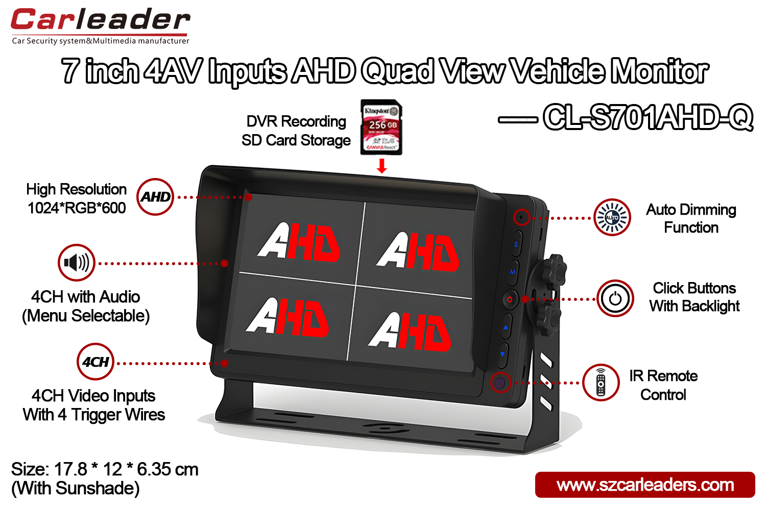 Carleader size ürünlerimizi sunmaktan gurur duyuyor7 İnç 4CH AHD Girişli Dört Görünümlü Ekran MonitörüDörtlü görünüm tasarımı, araç kamerası için Ön Görünüm, Yan Görünüm x2, Arka Görünüm gibi 4 kanalı destekleyebilir ve büyük araç sürücülerinin (otobüsler, kamyonlar ve kamyonetler) aracı çalıştırırken çevrelerinin birden fazla görünümünü izlemesine olanak tanır.