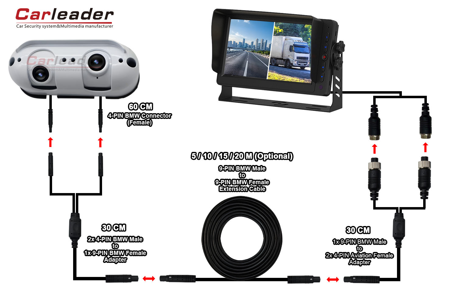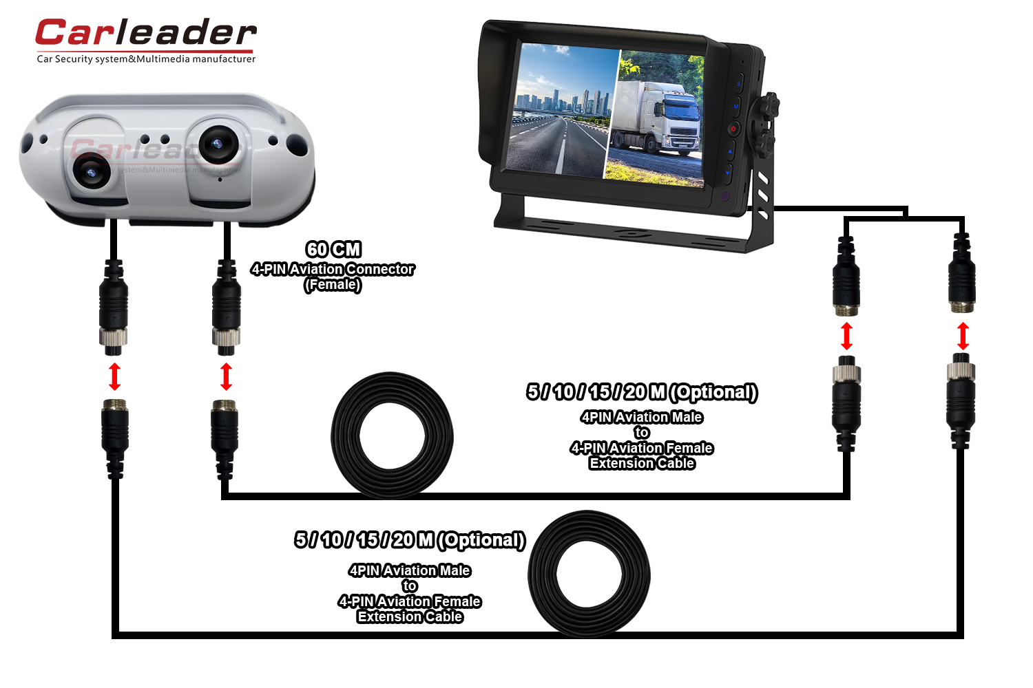 Carleader, farklı kablolama ihtiyaçlarına uyacak şekilde AHD Starlight Çift Lensli Ağır Hizmet Arka Görüş Kamerası için iki farklı kablolama çözümü sunacak: