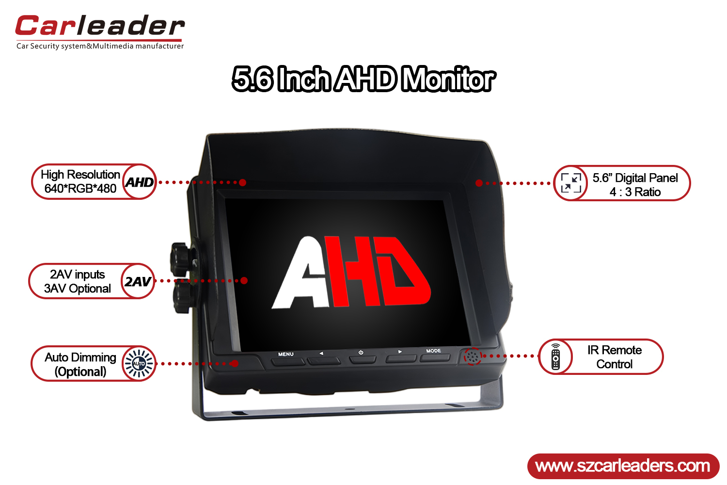 Araba Lideri5,6 İnç 2CH AHD Girişli Araç Yedekleme Monitörüprofesyonel kalitede 5,6 inçtirAHD arka görüş monitörüAraç güvenliği ve izleme sistemleri için net ve güvenilir bir görüntü sunmak üzere tasarlanmıştır. Modern bir tasarıma ve sağlam işlevselliğe sahip olan bu ürün, güvenilir arka görüş gerektiren ticari ve özel araçlar için ideal bir çözümdür.