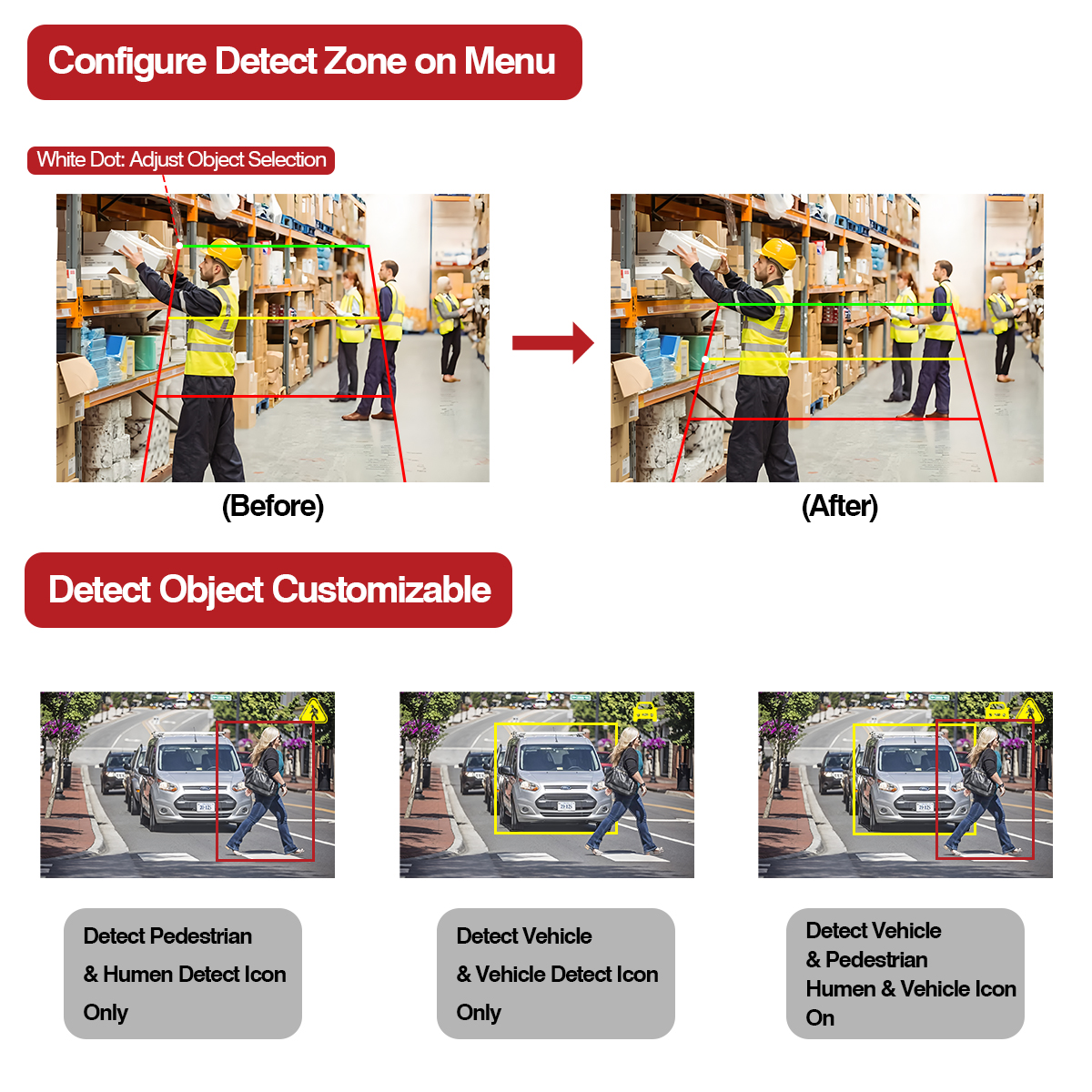 Dahili uyarı ışığı işlevine sahip bu AI Kamera, algılama nesnesi farklı algılama alanına (Kırmızı, Sarı, Yeşil) girdiğinde ışık rengi karşılık gelen renge değişecektir. Ayrıca aracınıza yaklaşan yaya ve araç alarmını alarmla entegre edin.