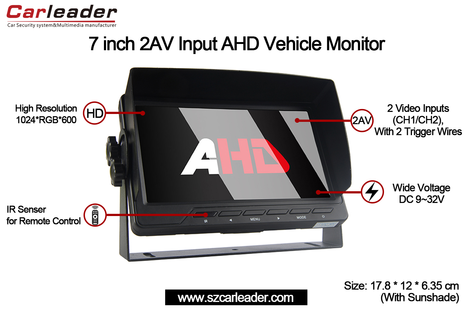 Araba Lideri7 İnç AHD 2CH Girişli Araç Monitörügüvenilirliği, netliği ve çok yönlülüğü kompakt ve dayanıklı bir tasarımda birleştirerek profesyonel ve kişisel araç izleme ihtiyaçları için mükemmel bir seçimdir.