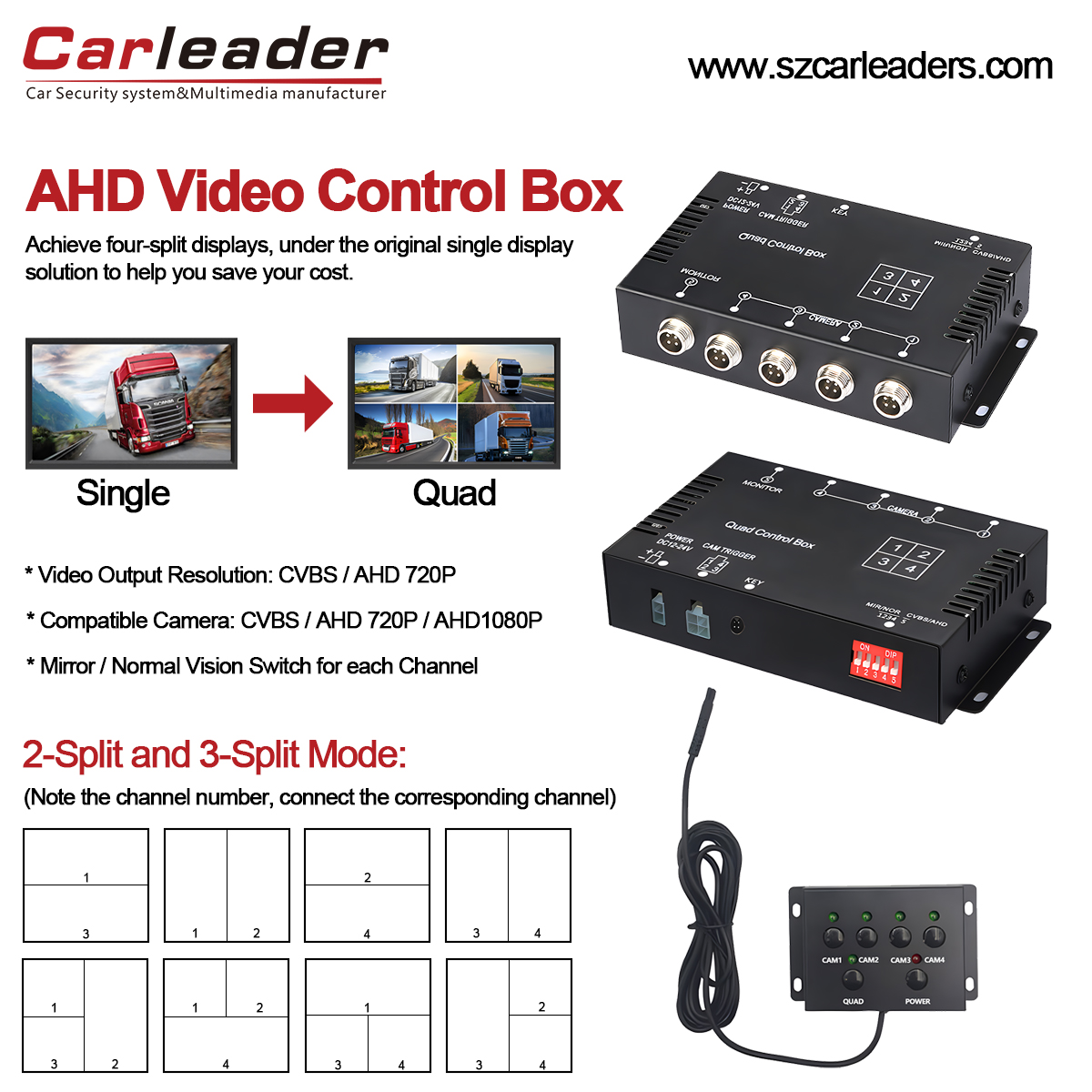 Bu AHD dörtlü video bölme kutusunun özü, araçlar için tek bir cihazda birleştirilmiş bir güç kaynağı ve bir video çoklayıcıdır. Otobüsler, kamyonlar, römorklar ve diğer ağır hizmet araçları gibi. 4 kanallı, dört adede kadar bağımsız AHD kamerayı destekleyecek şekilde tasarlanmıştır. Ve tek bir monitörle çalışır. Dörtlü görünüm, AHD 4 kanallı kontrol kutusunun birincil işlevidir. Araç AHD bölünmüş kontrol kutusu, bağlı dört araç kamerasının tamamından video sinyallerini alır ve dört görüntünün tümünü aynı anda tek ekranlı monitörde görüntüler. Kontrol kutusu, kutunun diğer işlevlerini ifade eder; AHD bölünmüş kontrol kutusu, kameralara güç sağlar ve tek bir ekranı veya bölünmüş ekran görüntülerini kontrol eder. AHD (Analog Yüksek Çözünürlük), ekran ve kontrol kutusuyla uyumlu video formatlarını belirtir. AHD video kontrol kutusu, AHD kameralar (örn. AHD 720p, 1080p) veya CVBS kameralar için uygundur. Aynı anda yalnızca dört AHD kamera veya dört CVBS kamera desteklenir.